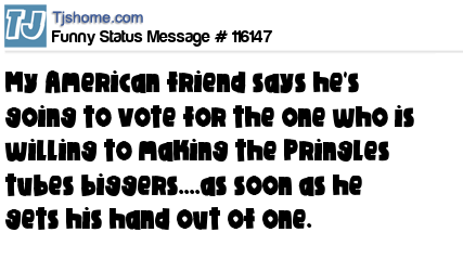 X is My American friend says he's going to vote for the one who is willing to making the Pringles tubes biggers....as soon as he gets his hand out of one.