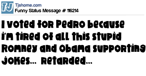 X says I voted for Pedro because i'm tired of all this stupid Romney and Obama supporting jokes... retarded...