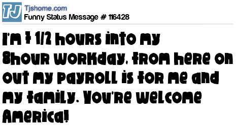 X I'm 7 1/2 hours into my 8hour workday, from here on out my payroll is for me and my family. You're welcome America!