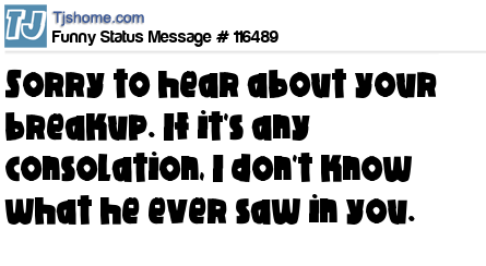 X says Sorry to hear about your breakup. If it's any consolation, I don't know what he ever saw in you.