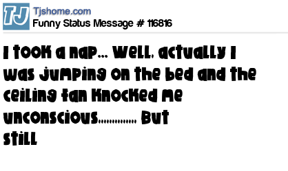 - # 98474 My ceiling fan has three settings: -- very slow -- Medium ,, and --I'm about to fly off the ceiling and kill you in a freak ceiling fan accident