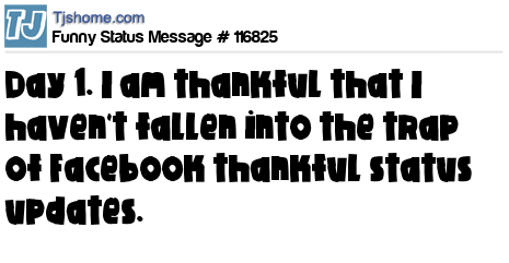 X is Day 1. I am thankful that I haven't fallen into the trap of Facebook thankful status updates.