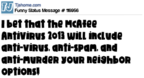 X is I bet that the McAfee AntiVirus 2013 will include anti-virus, anti-spam, and anti-murder your neighbor options!