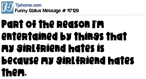 X says Part of the reason I'm entertained by things that my girlfriend hates is because my girlfriend hates them.