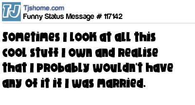 X says Sometimes I look at all this cool stuff I own and realise that I probably wouldn't have any of it if I was married.