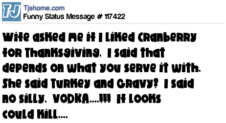 X is Wife asked me if I liked Cranberry for Thanksgiving, I said that depends on what you serve it with. She said Turkey and Gravy? I said no silly, VODKA....!!! If looks could kill....