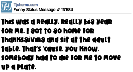 X  This was a really, really big year for me. I got to go home for Thanksgiving and sit at the adult table. That's 'cause, you know, somebody had to die for me to move up a plate.