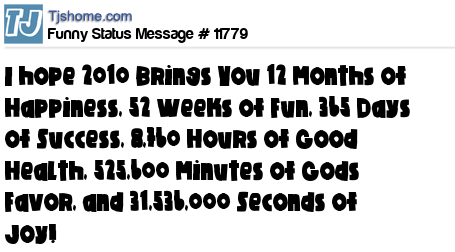 - # 11777 I Wish 2010 Brings You 12 Months of Happiness,52 Weeks of Fun,365 Days of Success,8760 Hours of Good Health, 52600 Minutes of Good Luck and 3153600 Seconds of Joy!