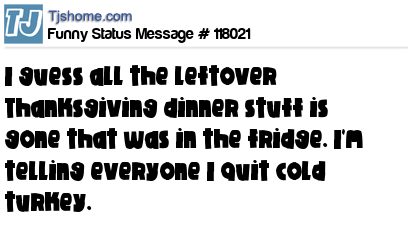- # 80642 Happy Thanks Giving! Today I will stuff myself and eat all that I can, tomorrow I will eat the rest of the left overs and then I am going to quit cold turkey.