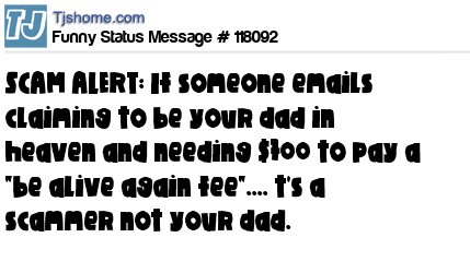 X SCAM ALERT: If someone emails claiming to be your dad in heaven and needing $700 to pay a "be alive again fee".... t's a scammer not your dad.