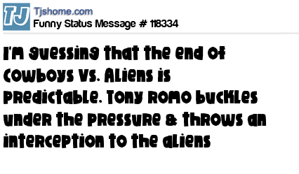 X I'm guessing that the end of Cowboys Vs. Aliens is predictable. Tony romo buckles under the pressure & throws an interception to the aliens