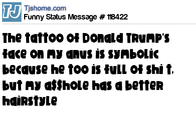 X says The tattoo of Donald Trump's face on my anus is symbolic because he too is full of shi t, but my a$$hole has a better hairstyle