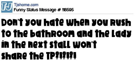 X says Don't you hate when you rush to the bathroom and the lady in the next stall won't share the TP?!?!?!