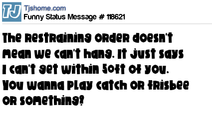 X says The restraining order doesn't mean we can't hang. It just says I can't get within 50ft of you. You wanna play catch or frisbee or something?