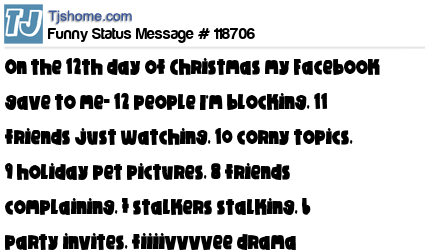 - # 162925 ♪ ♩♩ ♬ On the 12th Day of Christmas my Facebook gave to me, 12 dudes I'm blocking, 11 friends just watching, 10 corny topics, 9 busted barbies, 8 friends complaining, 7 stalkers stalking, 6 party invites, Fiiiiiiiiiiiiive Drama Queeeensssss,