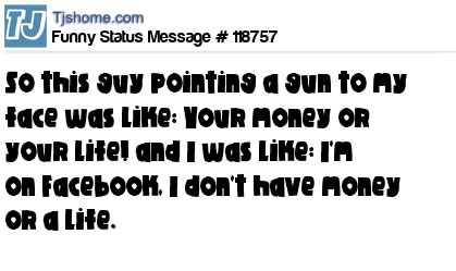 X says So this guy pointing a gun to my face was like: Your money or your life! and I was like: I'm on Facebook, I don't have money or a life.