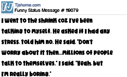 X I went to the shrink coz I've been talking to myself. He asked if I had any stress, told him no. He said, "Don't worry about it then...millions of people talk to themselves." I said, "Yeah, but I'm really boring."