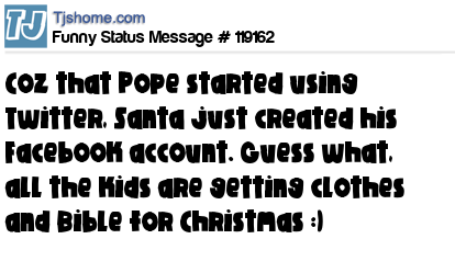 X is Coz that Pope started using Twitter, Santa just created his Facebook account. Guess what, all the kids are getting clothes and Bible for Christmas :)