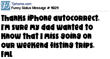 X is Thanks iPhone autocorrect, I'm sure my dad wanted to know that I miss going on our weekend fisting trips. Fml