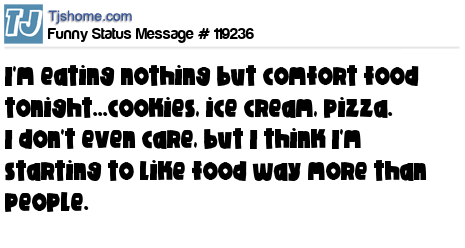 X says I'm eating nothing but comfort food tonight...cookies, ice cream, pizza. I don't even care, but I think I'm starting to like food way more than people.