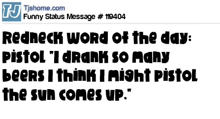X Redneck word of the day: pistol "I drank so many beers I think I might pistol the sun comes up."