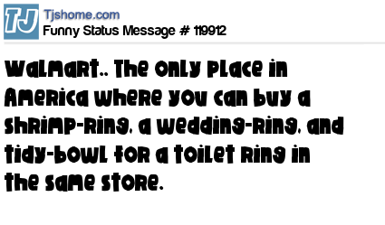 X Walmart.. The only place in America where you can buy a shrimp-ring, a wedding-ring, and tidy-bowl for a toilet ring in the same store.