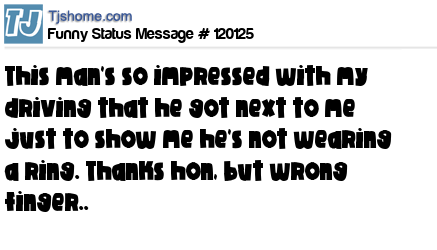 - # 120152 This woman's so impressed at my driving that she got next to me just to show me she's not wearing a ring. Thanks hon, but wrong finger