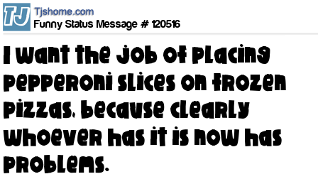 X I want the job of placing pepperoni slices on frozen pizzas, because clearly whoever has it is now has problems.