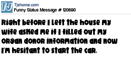 X Right before I left the house my wife asked me if I filled out my organ donor information and now I'm hesitant to start the car.