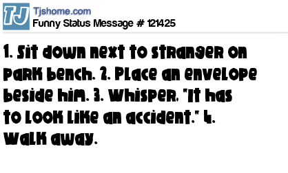 X says 1. Sit down next to stranger on park bench. 2. Place an envelope beside him. 3. Whisper, "It has to look like an accident." 4. Walk away.
