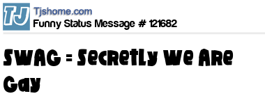 - # 109311 "SWAG" LOL....I love to know where words originate from and in the 1960's a group of men came up with the term "SWAG"....it's meaning Secretly We Are G@y!! True story!! So go get your SWAG on and please post on FB everytime you do so I can laugh at you!!