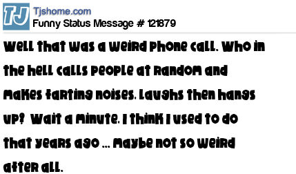 X Well that was a weird phone call. Who in the hell calls people at random and makes farting noises, laughs then hangs up? Wait a minute, I think I used to do that years ago ... maybe not so weird after all.