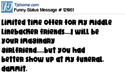 X Limited time offer for my middle linebacker friends....I will be your imaginary girlfriend.....but you had better show up at my funeral, dammit.