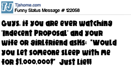 X is Guys, if you are ever watching 'Indecent Proposal' and your wife or girlfriend asks: "Would you let someone sleep with me for $1,000,000?" Just lie!!