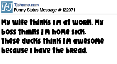 - # 74913 My wife thinks I'm at work. My boss thinks I'm home sick. These ducks think I'm awesome because I have the bread.