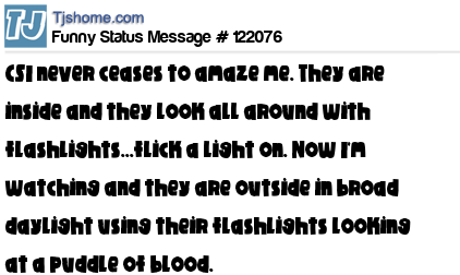 X CSI never ceases to amaze me. They are inside and they look all around with flashlights...flick a light on. Now I'm watching and they are outside in broad daylight using their flashlights looking at a puddle of blood.