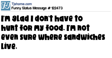 X says I'm glad I don't have to hunt for my food. I'm not even sure where sandwiches live.