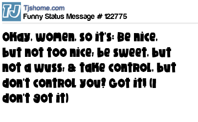 X says Okay, women, so it's: Be nice, but not too nice; be sweet, but not a wuss; & take control, but don't control you? Got it! (I don't got it)