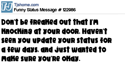 X says Don't be freaked out that I'm knocking at your door. Haven't seen you update your status for a few days, and just wanted to make sure you're okay.