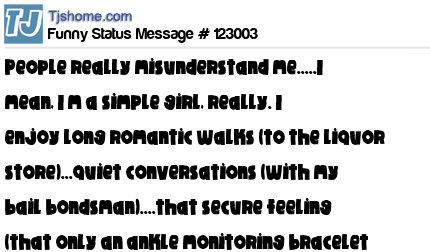 X People really misunderstand me.....I mean, I’m a simple girl, really. I enjoy long romantic walks (to the liquor store)...quiet conversations (with my bail bondsman)....that secure feeling (that only an ankle monitoring bracelet can bring)...