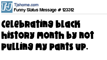 - # 45124 Celebrating Black History Month. I got my baggy FUBU jeans on with the chicken pouch... I hope my month is full of drive bys, gangster rap, 40 ozers, drug deals, watermelon and lots of fried chicken.... Happy Black History Month!!!!!!!