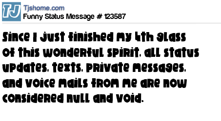 X says Since I just finished my 4th glass of this wonderful spirit, all status updates, texts, private messages, and voice mails from me are now considered null and void.