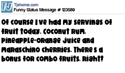 X Of course I’ve had my servings of fruit today. Coconut rum, pineapple-orange juice and maraschino cherries. There’s a bonus for combo fruits, right?