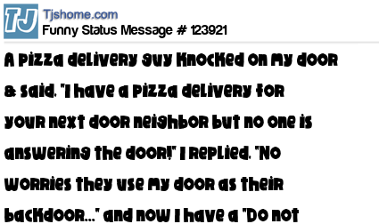 X is A pizza delivery guy knocked on my door & said, "I have a pizza delivery for your next door neighbor but no one is answering the door!" I replied, "No worries they use my door as their backdoor..." and now I have a "Do not disturb" poster on my door.