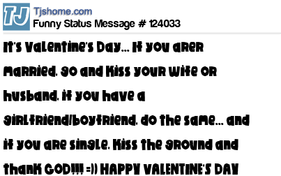 X It's Valentine's Day... If you arer married, go and kiss your wife or husband, if you have a girlfriend/boyfriend, do the same... and if you are single, kiss the ground and thank GOD!!! =)) HAPPY VALENTINE'S DAY