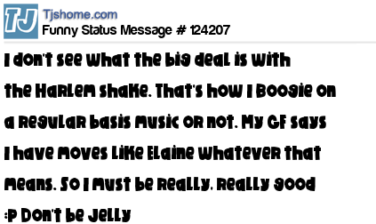 X I don't see what the big deal is with the Harlem shake. That's how I Boogie on a regular basis music or not. My GF says I have moves like Elaine whatever that means. So I must be really, really good :p Don't be Jelly