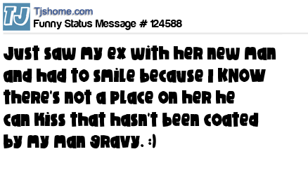 X says Just saw my ex with her new man and had to smile because I KNOW there's not a place on her he can kiss that hasn't been coated by my man gravy. :)