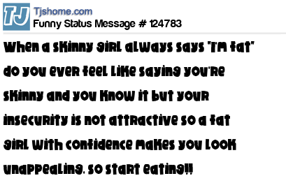 X is When a skinny girl always says "I'm fat" do you ever feel like saying you're skinny and you know it but your insecurity is not attractive so a fat girl with confidence makes you look unappealing, so start eating!!