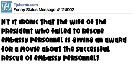 X is n't it ironic that the wife of the president who failed to rescue embassy personnel is giving an award for a movie about the successful rescue of embassy personnel?