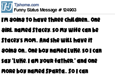 X is I'm going to have three children.. One girl, named Stacey, so my wife can be Stacey's mom.. And she will have it going on.. One boy named Luke, so I can say "Luke, I am your father." and one more boy named Sparta.. So I can introduce him 'THIS IS SPARTAA'